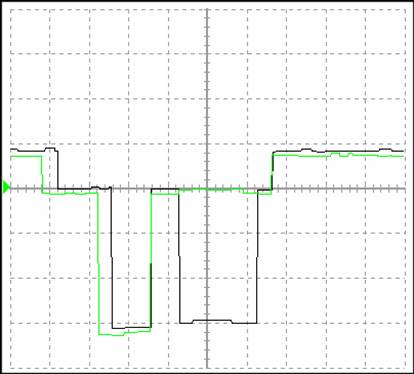 23) Gemessen habe ich erstmal mit zwei Tastern an den Pins 10 und 11, jeweils gegen GND. Da ich das Ergebnis nicht so ganz verstand (und ja auch den Schaltplan nicht ganz aufgedröselt habe), habe ich kurz entschlossen mal „differentiell“ gemessen: Pin 10 als Signal, Pin 11 als Masse[grüne Kurve]. Sinngemäß das Gleiche mit den Pins 8 und 9 für die rechte Seite[schwarze Kurve]. Der Robomaxx ist im Modus „B“. Das linke Rad dreht sich nur vorwärts, gelegentlich zeigt es zwei kurze Stops, das rechte Rad dreht in der Zeit zwischen den Stops rückwärts: